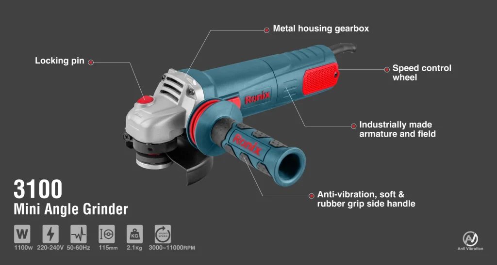 فاکتورهایی مانند اندازهی صفحهی برش، توان موتور، سرعت، امکانات ایمنی، ابعاد دستگاه و … در انتخاب مینی فرز موثر هستند. مینی فرز برقی 3100 رونیکس، مجهز به موتور قدرتمند 1100 وات بوده و در حالت آزاد، سرعتی در محدودهی 11000-3000 دور بر دقیقه را ایجاد میکند. قطر صفحه مورد استفاده در این مینی فرز، 115 میلیمتر است. میتوان با وجود دیمر تنظیم سرعت، از این ابزار برای انجام فعالیتهایی مانند کفسابی، برش مواد مختلف، صافکردن بیرونزدگی و تیزکردن سایر ابزارها استفاده کرد.